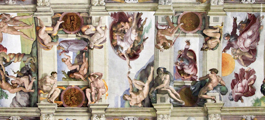 Obras-primas de Michelangelo, Guercino, Bernini e outros! Vestimentas, relicários, mapas, documentos e ambientes cenograficamente recriados, como o teto da Capela Sistina (na imagem acima, Pietà, na imagem abaixo, ambos de Michelangelo).